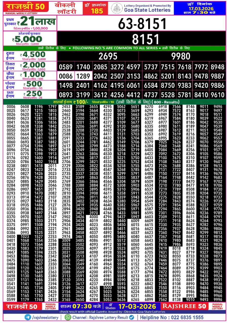 Rajshree 50 Lottery Result Today 7:30 PM – 17 March 2026 – Live Draw March 17, 2026 Related Results Rajshree 50 Lottery Result Today 7:30 PM – 07 February 2026 – Live Draw Rajshree 50 Lottery Result Today 7:30 PM – 30 June 2025 – Live Draw & Rajshree 50 Lottery Result Today 7:30 PM – 22 November 2025 – Live Draw Rajshree 50 Lottery Result Today 7:30 PM – 11 February 2026 – Live Draw