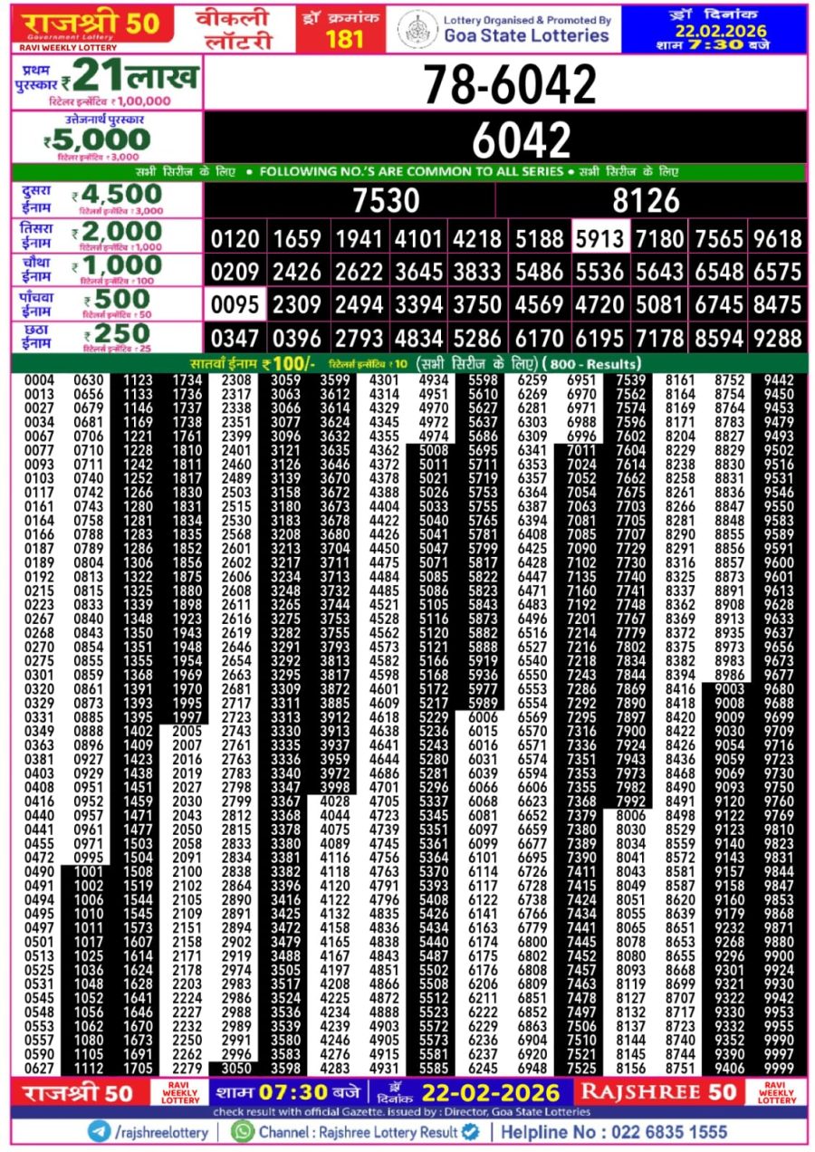 Rajshree 50 Lottery Result Today 7:30 PM – 22 February 2026 – Live Draw February 22, 2026 Related Results Rajshree 50 Lottery Result Today 7:30 PM – 25 June 2025 – Live Draw & Rajshree 50 Lottery Result Today 7:30 PM – 07 August 2025 – Live Draw & Rajshree 50 Lottery Result Today 7:30 PM – 09 January 2026 – Live Draw Rajshree 50 Lottery Result Today 7:30 PM – 28 January 2026 – Live Draw