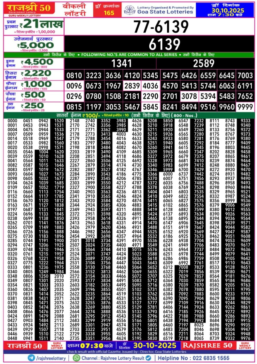 Rajshree 50 Lottery Result Today 7:30 PM – 30 October 2025 – Live Draw October 30, 2025 Related Results Rajshree 50 Lottery Result Today 7:30 PM – 29 September 2025 – Live Draw & Rajshree Lottery Result 5:40 PM – 25 August 2025 – Live Draw & Winners Rajshree Lottery Result 5:40 PM – 16 August 2025 – Live Draw & Winners Rajshree 50 monthly lottery result 22 May 2025