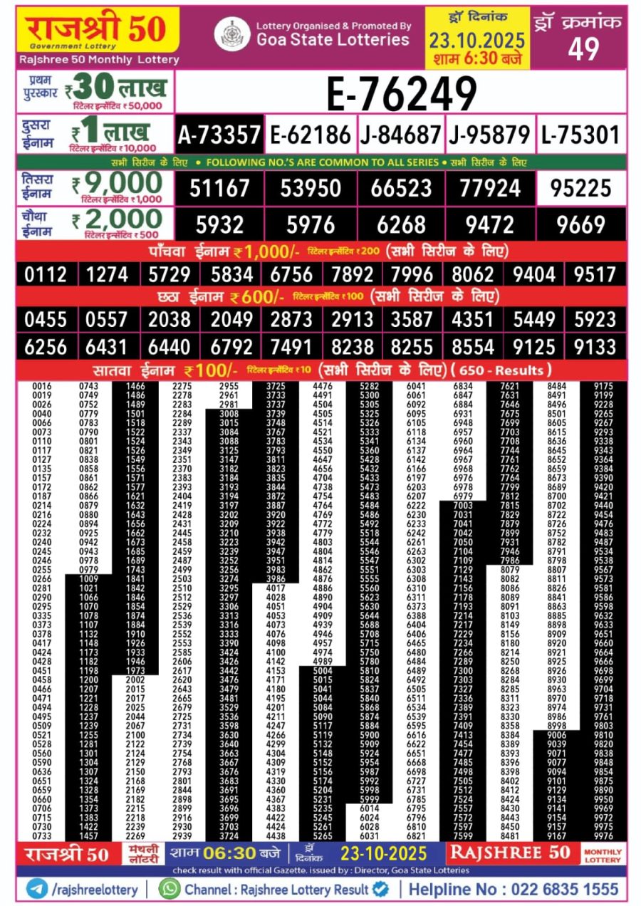 Rajshree 50 Monthly Lottery Result 23 October 2025 October 23, 2025 Related Results Rajshree Lottery Result 5:40 PM – 14 July 2025 – Live Draw & Winners Rajshree 30 Lottery Result 8:30 PM – 27 September 2025 – Live Draw & Winners Rajshree 50 Lottery Result Today 7:30 PM – 24 October 2025 – Live Draw Rajshree Lottery Result 5:40 PM – 20 September 2025 – Live Draw & Winners