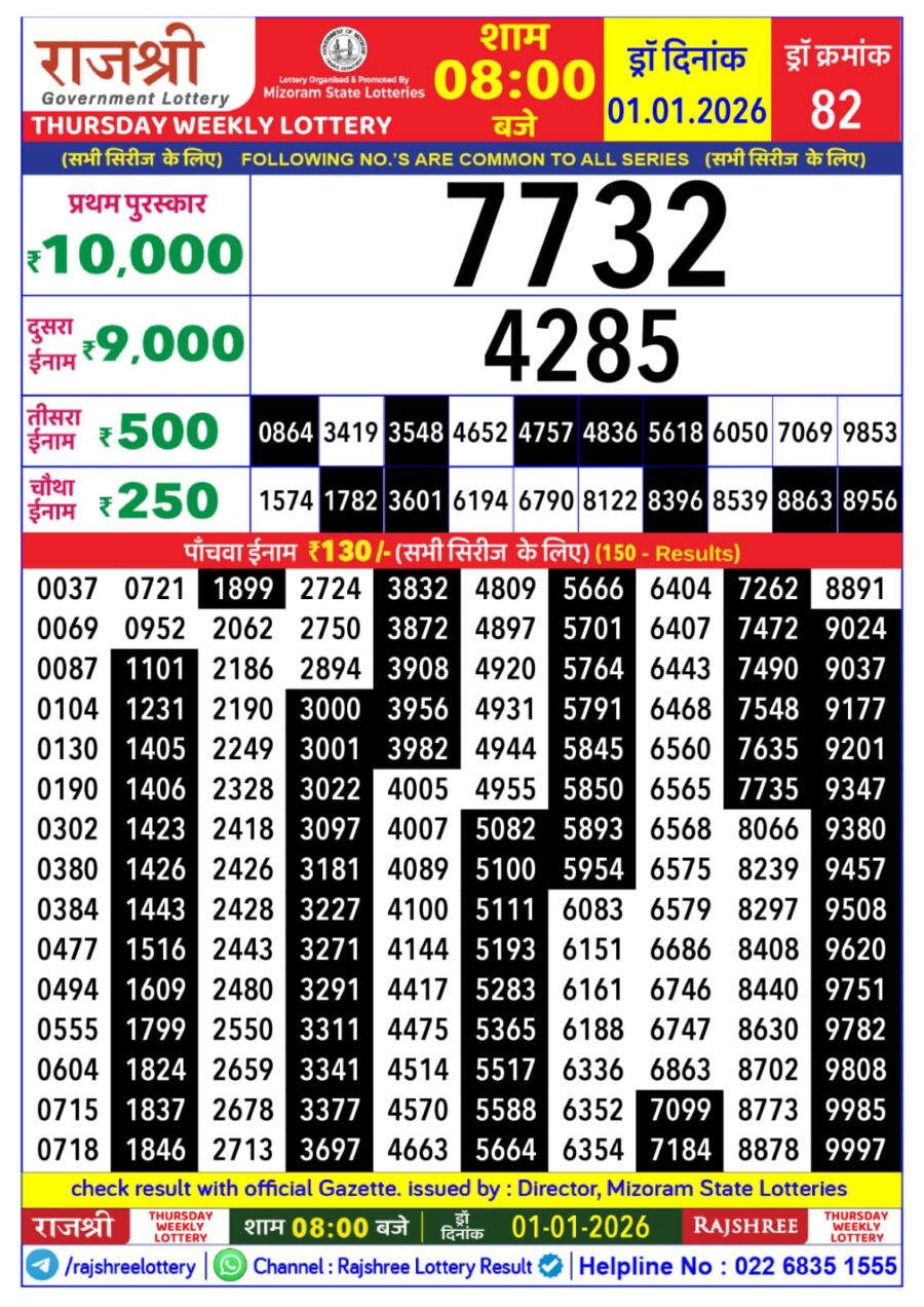 Rajshree Lottery 8 PM Result – 01 January 2026 – Live Draw & Winners January 1, 2026 Related Results Dear Lottery 8 PM Result – 19 October 2025 – Live Draw & Winners Dear Lottery 8 PM Result – 10 June 2025 – Live Draw & Winners Rajshree Lottery 8 PM Result – 07 October 2025 – Live Draw & Winners Rajshree Lottery 8 PM Result – 23 September 2025 – Live Draw & Winners