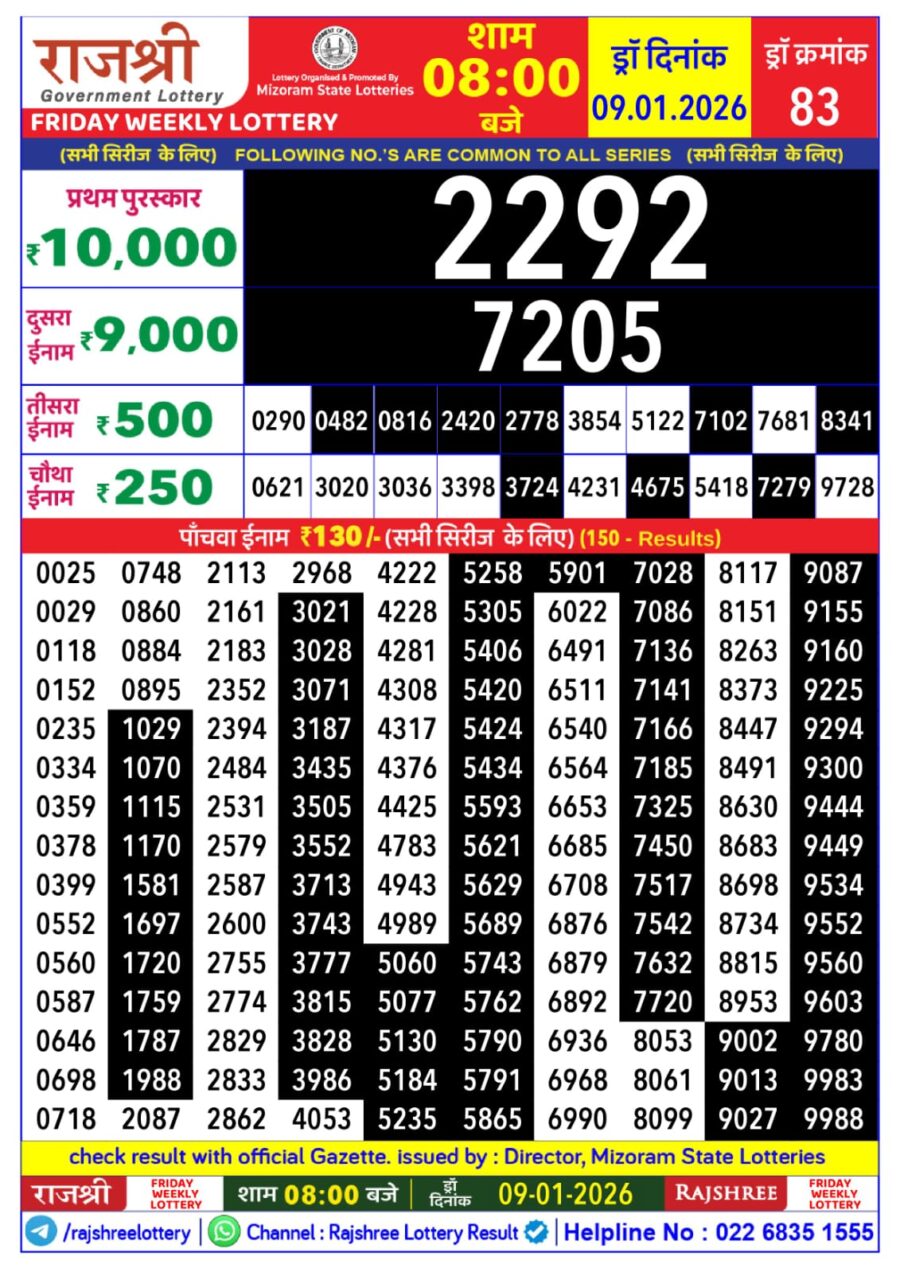 Rajshree Lottery 8 PM Result – 09 January 2026 – Live Draw & Winners January 9, 2026 Related Results Dear Lottery 8 PM Result – 15 May 2025 – Today’s Winning Ticket Numbers Dear Lottery 8 PM Result – 26 December 2025 – Live Draw & Winners Rajshree Lottery 8 PM Result – 29 August 2025 – Live Draw & Winners Rajshree Lottery 8 PM Result – 07 July 2025 – Live Draw & Winners