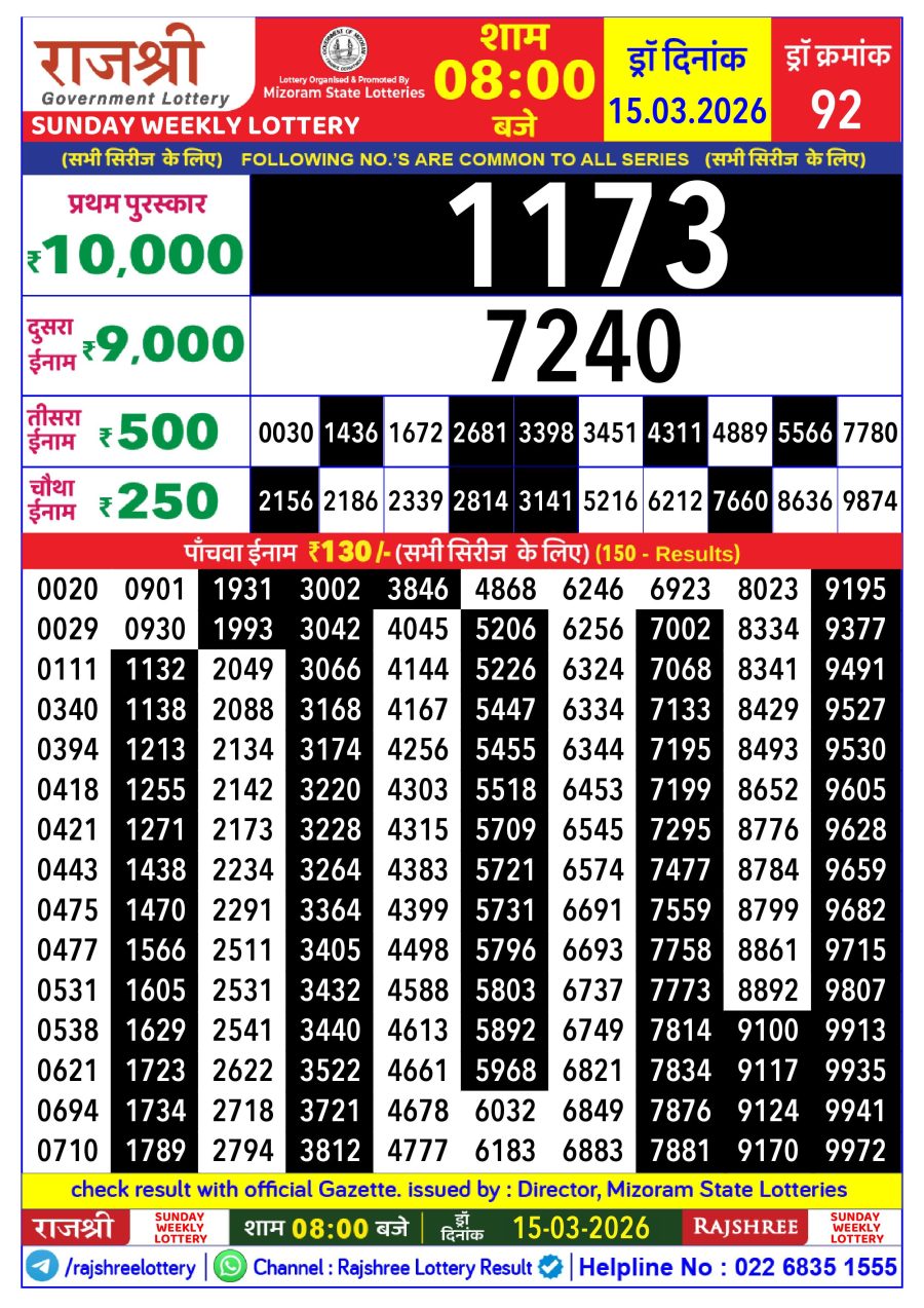 Rajshree Lottery 8 PM Result – 15 March 2026 – Live Draw & Winners March 15, 2026 Related Results Dear Lottery 8 PM Result – 3 June 2025 – Live Draw & Winners Dear Lottery 8 PM Result – 23 December 2025 – Live Draw & Winners Dear Lottery 8 PM Result – 26 November 2025 – Live Draw & Winners Dear Lottery 8 PM Result – 18 July 2025 – Live Draw & Winners