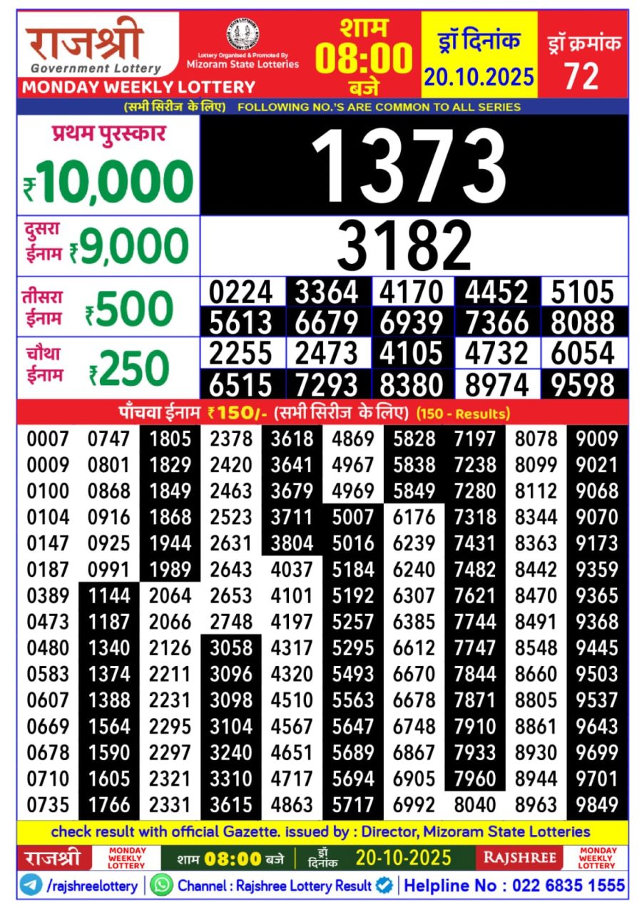 Rajshree Lottery 8 PM Result – 20 October 2025 – Live Draw & Winners October 20, 2025 Related Results Dear Lottery 8 PM Result – 20 June 2025 – Live Draw & Winners Dear Lottery 8 PM Result – 12 June 2025 – Live Draw & Winners Dear Lottery 8 PM Result – 26 June 2025 – Live Draw & Winners Rajshree Lottery 8 PM Result – 6 September 2025 – Live Draw & Winners