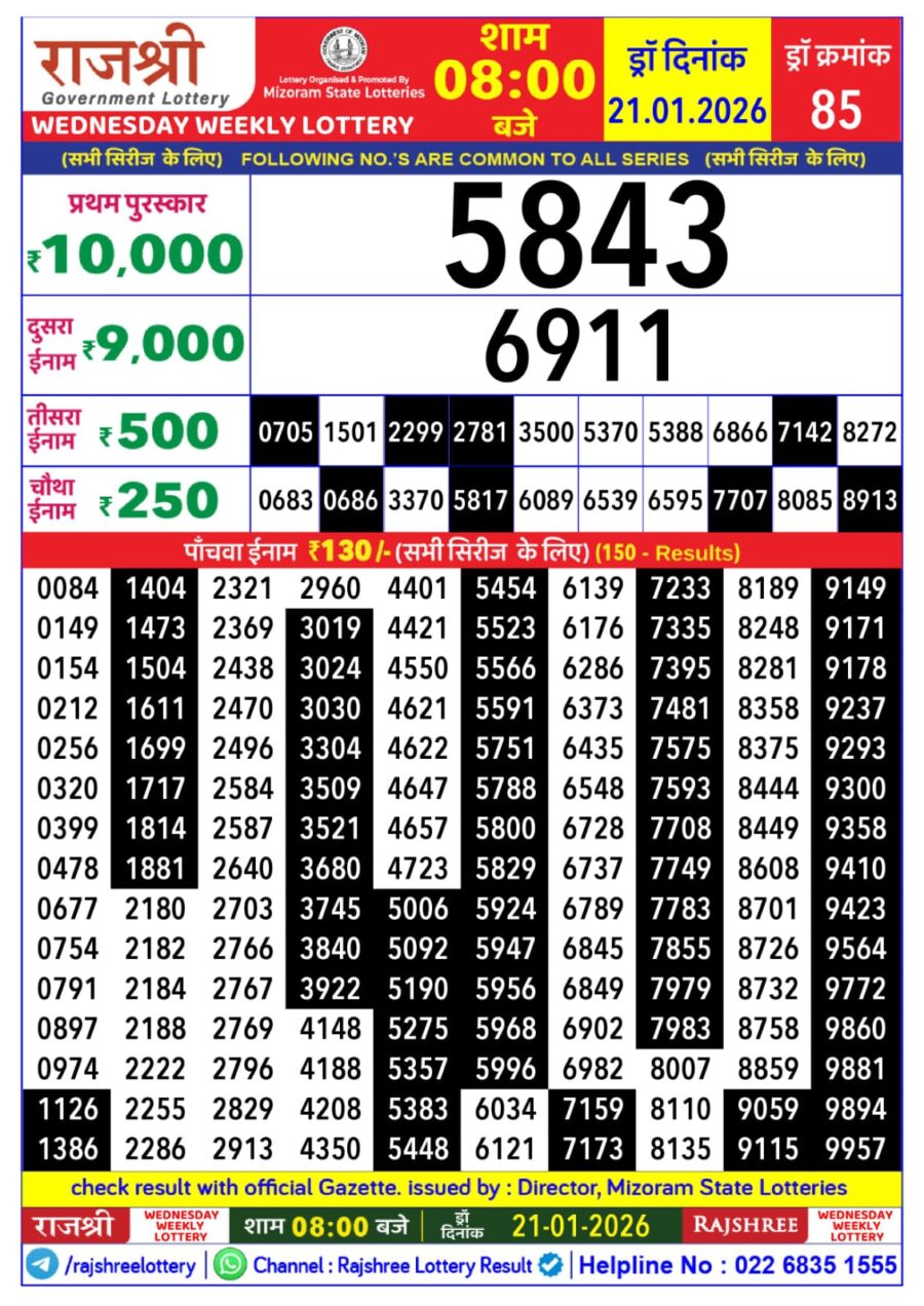 Rajshree Lottery 8 PM Result – 21 January 2026 – Live Draw & Winners January 21, 2026 Related Results Dear Lottery 8 PM Result – 23 November 2025 – Live Draw & Winners Dear Lottery 8 PM Result – 21 June 2025 – Live Draw & Winners Rajshree Lottery 8 PM Result – 24 December 2025 – Live Draw & Winners Dear Lottery 8 PM Result – 24 January 2026 – Live Draw & Winners