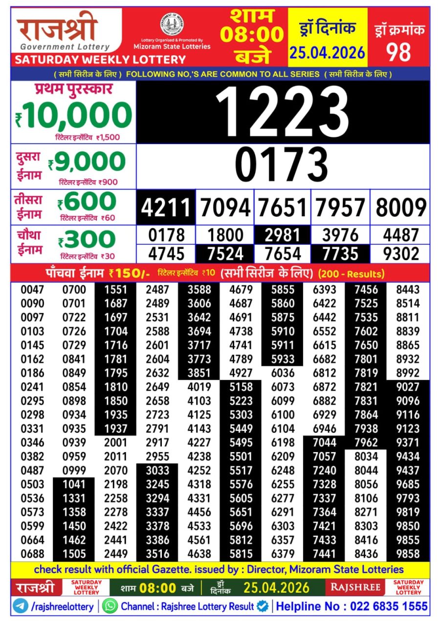 Rajshree Lottery 8 PM Result – 25 April 2026 – Live Draw & Winners April 25, 2026 Related Results Rajshree Lottery 8 PM Result – 5 September 2025 – Live Draw & Winners Dear Lottery 8 PM Result – 25 August 2025 – Live Draw & Winners Rajshree Lottery 8 PM Result – 09 October 2025 – Live Draw & Winners Dear Lottery 8 PM Result – 10 January 2026 – Live Draw & Winners
