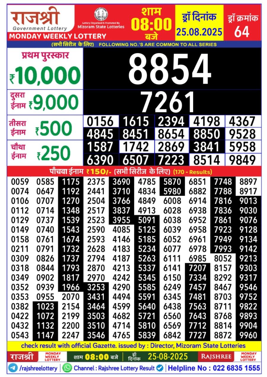 Rajshree Lottery 8 PM Result – 25 August 2025 – Live Draw & Winners August 25, 2025 Related Results Dear Lottery 8 PM Result – 1 June 2025 – Live Draw & Winners Dear Lottery 8 PM Result – 20 May 2025 – Today’s Winning Ticket Numbers Rajshree Lottery 8 PM Result – 21 September 2025 – Live Draw & Winners Dear Lottery 8 PM Result – 17 August 2025 – Live Draw & Winners