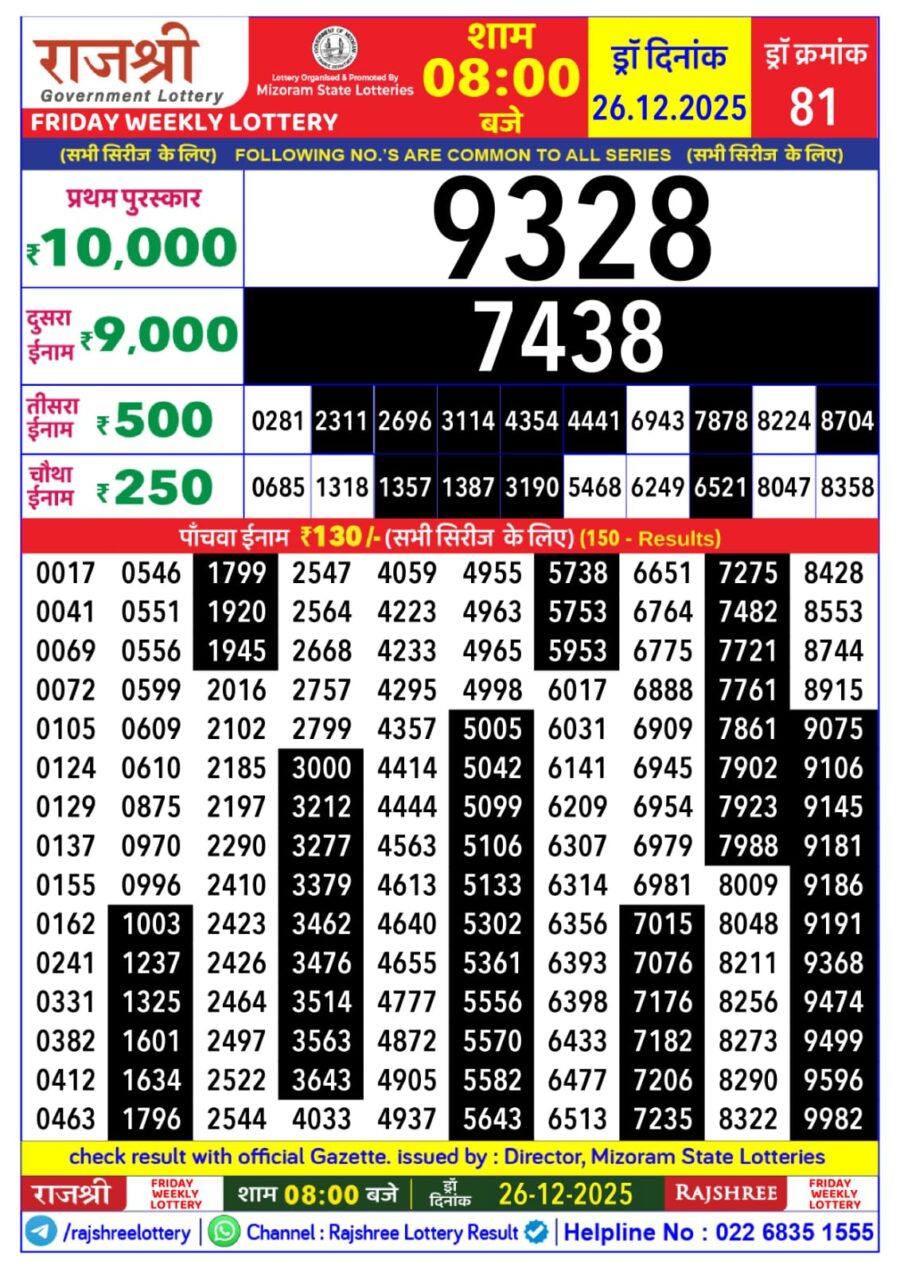 Rajshree Lottery 8 PM Result – 26 December 2025 – Live Draw & Winners December 26, 2025 Related Results Rajshree Lottery 8 PM Result – 23 July 2025 – Live Draw & Winners Rajshree Lottery 8 PM Result – 21 September 2025 – Live Draw & Winners Dear Lottery 8 PM Result – 10 August 2025 – Live Draw & Winners Rajshree Lottery 8 PM Result – 13 November 2025 – Live Draw & Winners