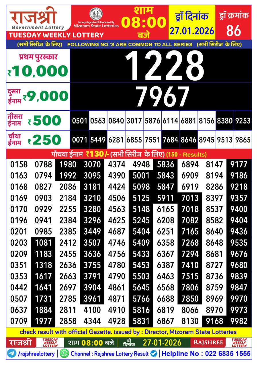Rajshree Lottery 8 PM Result – 27 January 2026 – Live Draw & Winners January 27, 2026 Related Results Dear Lottery 8 PM Result – 23 December 2025 – Live Draw & Winners Dear Lottery 8 PM Result – 15 October 2025 – Live Draw & Winners Rajshree Lottery 8 PM Result – 13 August 2025 – Live Draw & Winners Dear Lottery 8 PM Result – 20 October 2025 – Live Draw & Winners
