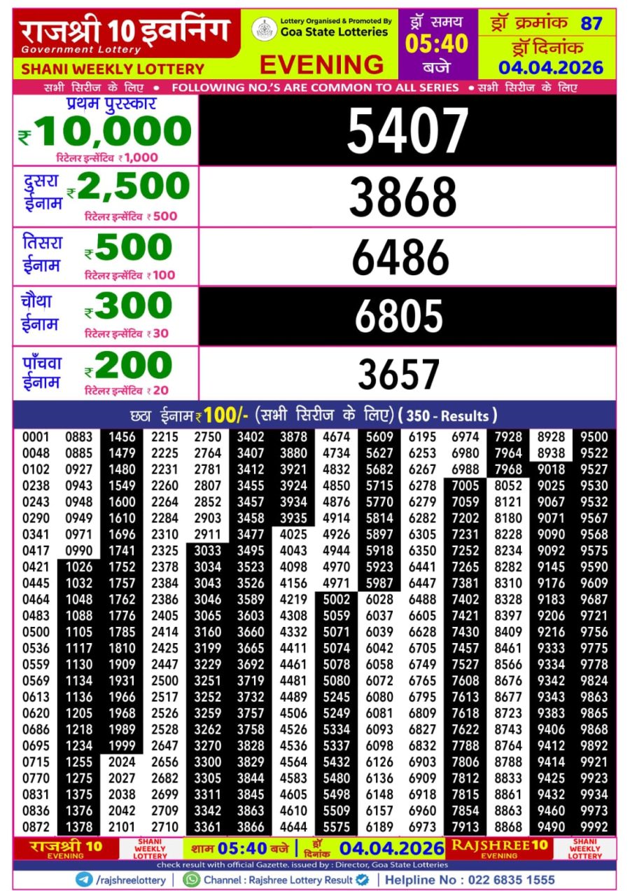 Rajshree Lottery Result 5:40 PM – 04 April 2026 – Live Draw & Winners April 4, 2026 Related Results Rajshree Lottery Result 5:40 PM – 21 August 2025 – Live Draw & Winners Rajshree Lottery Result 5:40 PM – 02 March 2026 – Live Draw & Winners Rajshree Lottery Result 5:40 PM – 15 September 2025 – Live Draw & Winners Rajshree Lottery Result 5:40 PM – 5 December 2025 – Live Draw & Winners