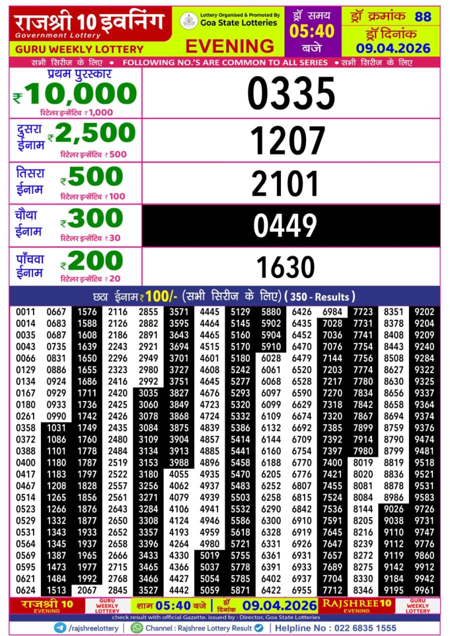 Rajshree Lottery Result 5:40 PM – 09 April 2026 – Live Draw & Winners April 9, 2026 Related Results Rajshree 30 Lottery Result 8:30 PM – 12 September 2025 – Live Draw & Winners Rajshree Lottery Result 5:40 PM – 01 January 2026 – Live Draw & Winners Rajshree 100 Monthly Lottery Result 7 August 2025 Live Draw & Winners Rajshree Lottery Result 5:40 PM – 14 February 2026 – Live Draw & Winners