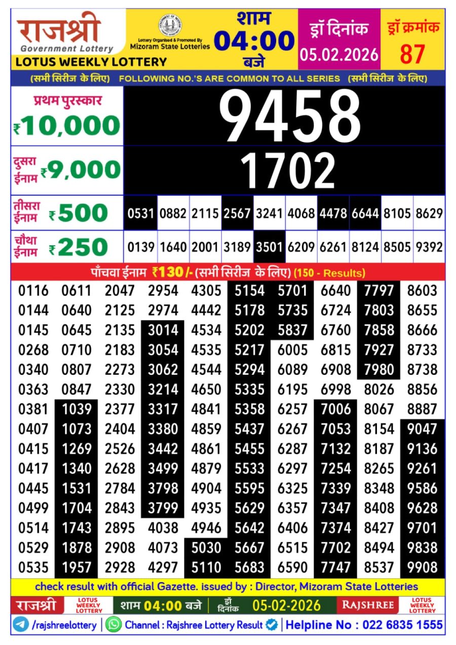 Rajshree Lottery Result Today 4 PM – 05 February 2026 – Live Draw & Winners February 5, 2026 Related Results LabhLaxmi Lottery Result Today 4 PM – 28 November 2025 – Live Draw & Winners Rajshree Lottery Result Today 4 PM – 16 January 2026 – Live Draw & Winners Rajshree Lottery Result Today 4 PM – 13 September 2025 – Live Draw & Winners Rajshree Lottery Result Today 4 PM – 30 September 2025 – Live Draw & Winners