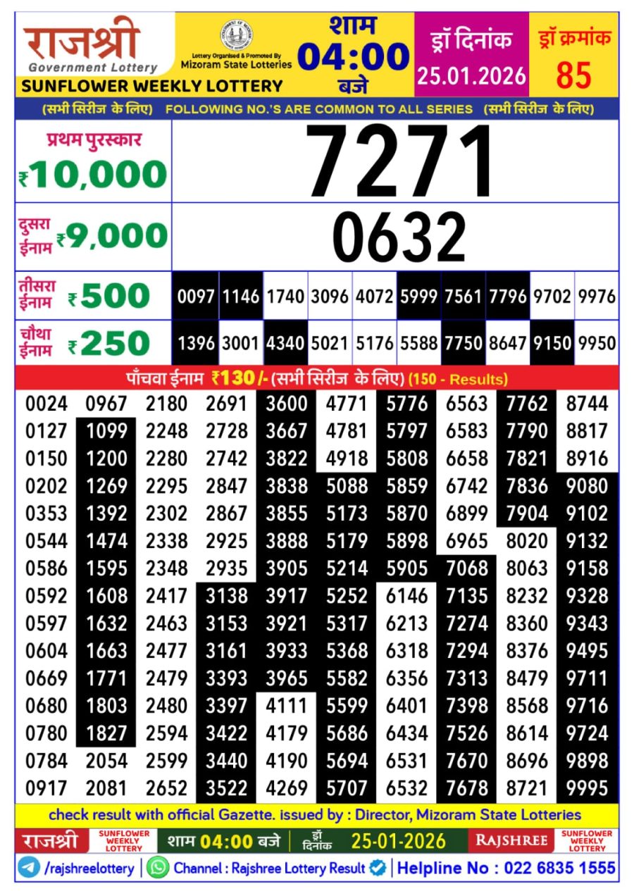 Rajshree Lottery Result Today 4 PM – 25 January 2026 – Live Draw & Winners January 25, 2026 Related Results Rajshree Lottery Result Today 4 PM – 24 September 2025 – Live Draw & Winners Rajshree Lottery Result Today 4 PM – 2 September 2025 – Live Draw & Winners Rajshree Lottery Result Today 4 PM – 10 September 2025 – Live Draw & Winners Labh Laxmi Lottery Result Today 4 PM – 10 August 2025 – Live Draw & Winners