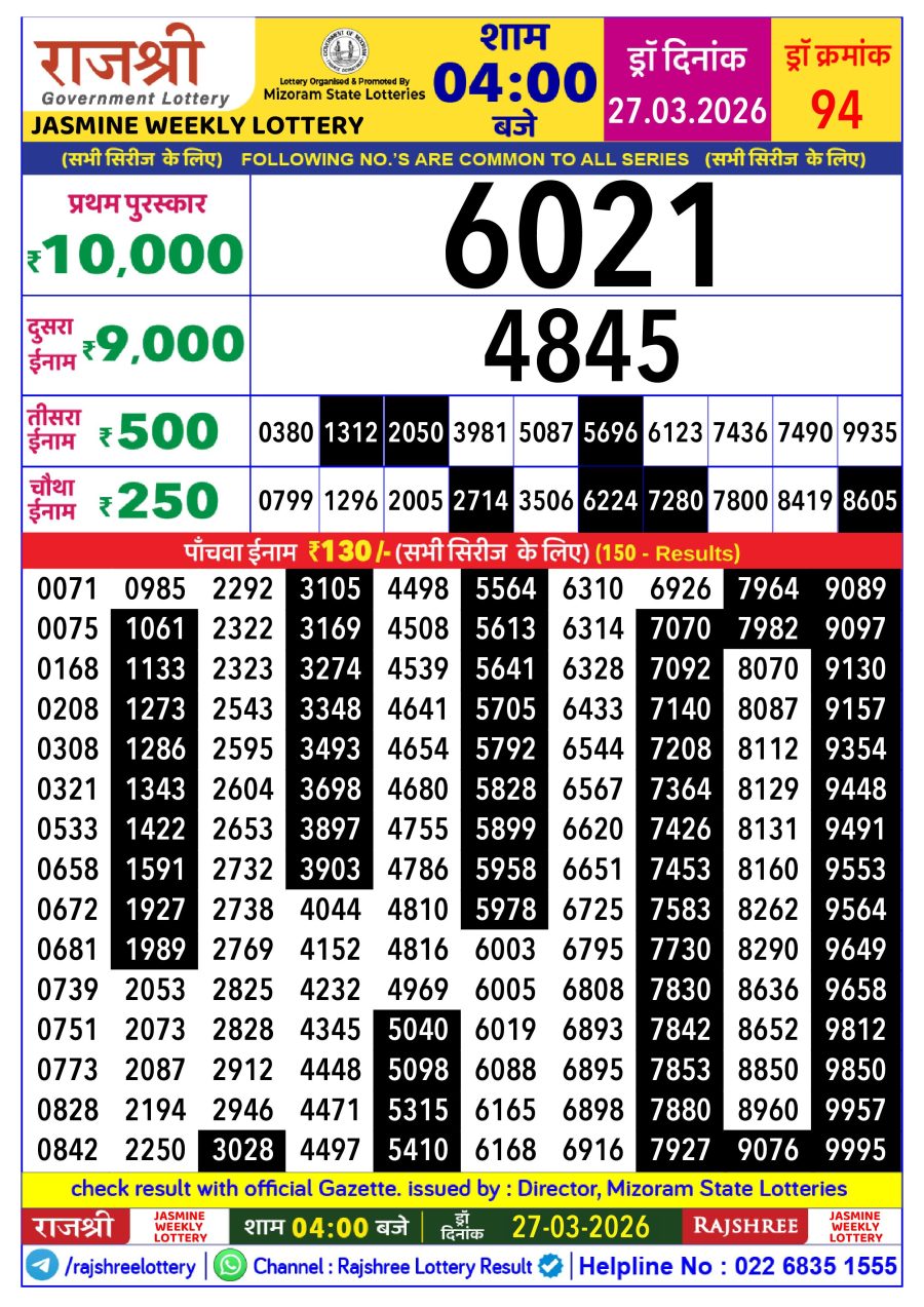Rajshree Lottery Result Today 4 PM – 27 March 2026 – Live Draw & Winners March 27, 2026 Related Results Rajshree Lottery Result Today 4 PM – 20 October 2025 – Live Draw & Winners Labh Laxmi Lottery Result Today 4 PM – 5 June 2025 – Live Draw & Winners LabhLaxmi Lottery Result Today 4 PM – 29 January 2026 – Live Draw & Winners Rajshree Lottery Result Today 4 PM – 13 December 2025 – Live Draw & Winners
