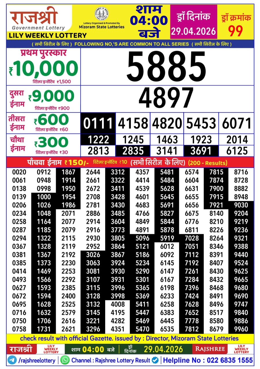 Rajshree Lottery Result Today 4 PM – 29 April 2026 – Live Draw & Winners April 29, 2026 Related Results Rajshree Lottery Result Today 4 PM – 15 September 2025 – Live Draw & Winners LabhLaxmi Lottery Result Today 4 PM – 25 March 2026 – Live Draw & Winners LabhLaxmi Lottery Result Today 4 PM – 13 March 2026 – Live Draw & Winners Labh Laxmi Lottery Result Today 4 PM – 25 July 2025 – Live Draw & Winners