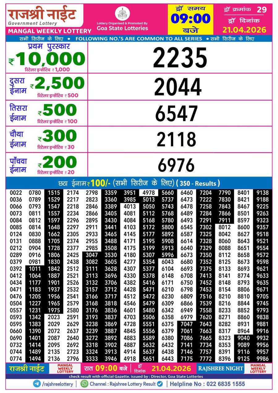 Rajshree Night Lottery 9pm Result 21 April 2026