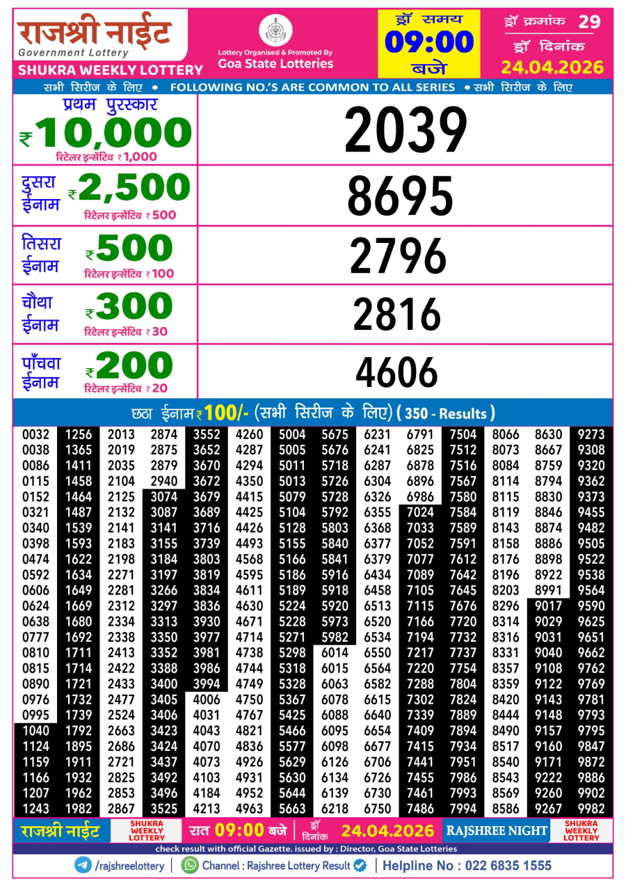 Rajshree Night Lottery 9pm Result 24 April 2026 April 24, 2026 Related Results Golden Star Lottery Result 9 PM Today – 01 November 2025 – Live Draw & Winners Golden Star Lottery Result 9 PM Today – 11 October 2025 – Live Draw & Winners Golden Lottery Result 9 PM Today – 01 July 2025 – Live Draw & Winners Golden Star Lottery Result 9 PM Today – 26 October 2025 – Live Draw & Winners