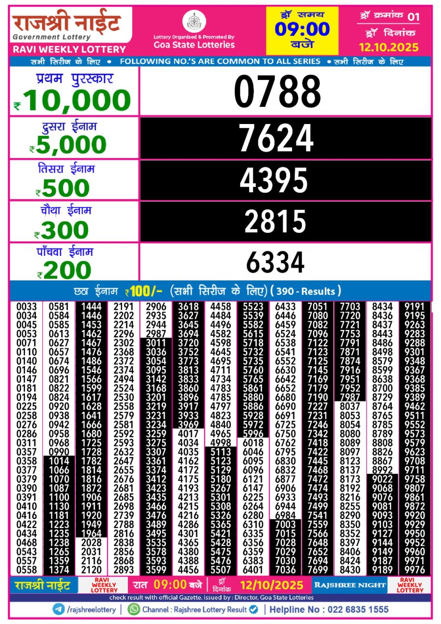 Rajshree Night Lottery Result Today 9PM – 12 October 2025 – Live Draw October 12, 2025 Related Results Golden Lottery Result 9 PM Today – 02 August 2025 – Live Draw & Winners Golden Lottery Result 9 PM Today – 25 May 2025 – Live Draw & Winners Golden Lottery Result 9 PM Today – 10 July 2025 – Live Draw & Winners Golden Lottery Result 9 PM Today – 9 June 2025 – Live Draw & Winners