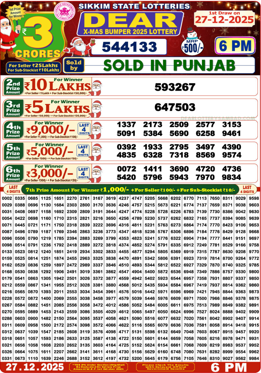 Sikkim state Dear X-Mas Bumper 2025 Lottery Result December 27, 2025 Related Results Rajshree 100 Monthly Lottery Result 01 January 2026 MAHARASHTRA GAURAV MONTHLY LOTTERY RESULT 19 November 25 SUVARNA KERALAM SK 29 Frist Prize Winning Number 28 November 2025 Rajshree 200 Monthly Lottery Result 20 November 2025