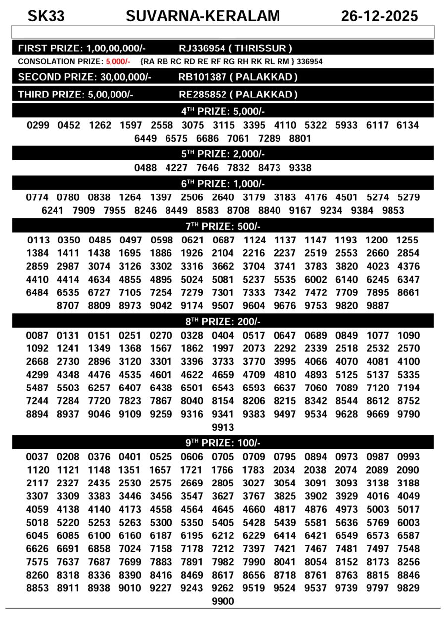Suvarna Keralam Lottery Result Today 26 December 2025 December 26, 2025 Related Results Kerala Lottery Result Today Samrudhi SM 34 21 December 2025 Samrudhi Lottery Result SM32 Live 7 December 2025 Kerala Lottery Result 04.12.2025: Karunya Plus KN600 Winners Kerala Lottery Result Dhanalekshmi DL32 24 December 2025